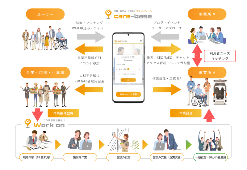 Workon機能は、企業と事業所をつなぎ、作業依頼をスムーズにマッチングできる仕組みを備えています。
