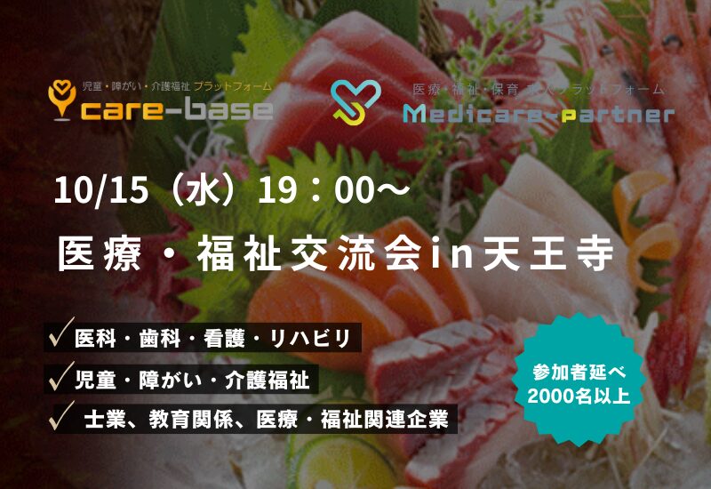 みんなの街EXPO~医療・福祉交流会~は、大阪・兵庫・京都で開催している医療・福祉事業者及び関連企業様との交流の場として2021年より開催している交流会です。事業者同士の連携やより福祉サービスをスムーズに運営できるよう開催から延べ2000名以上の参加者にご参加頂いております。大阪では天王寺・中津・豊中の3ヶ所で開催しておりますので、ぜひお近くの事業者さまをお誘いあわせの上ご参加ください。